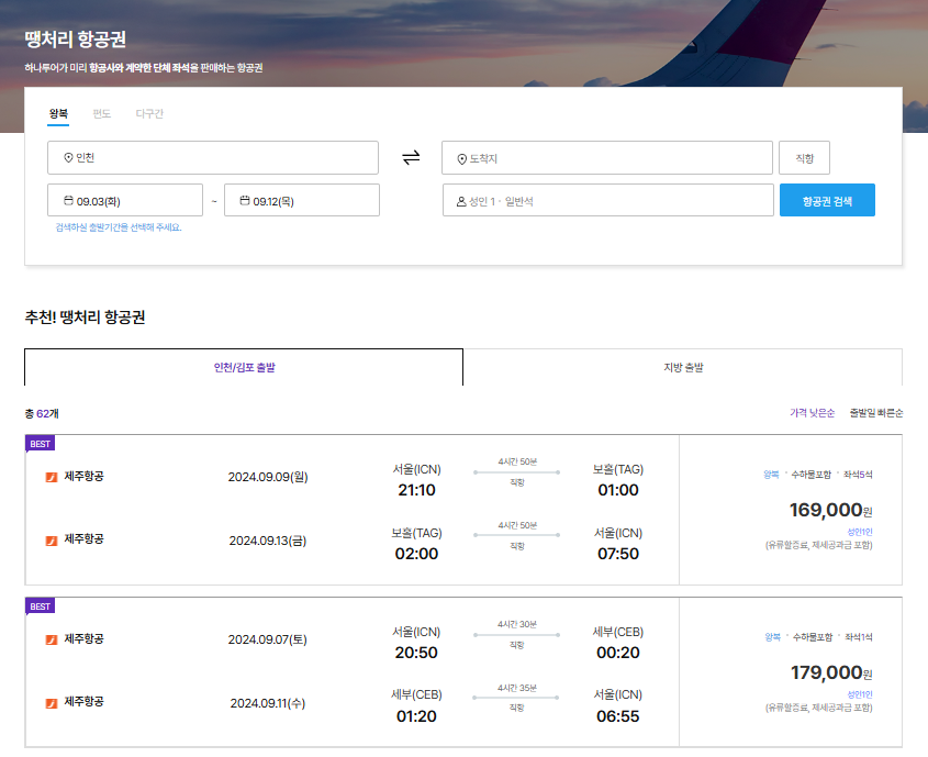 1) 하나투어는 땡처리 항공권이라고도 합니다. 사이트에 들어가서 출발지와 도착지, 날짜와 인원수 선택 후 항공권 검색을