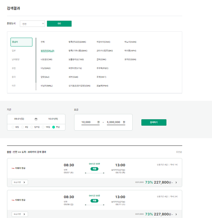 2) 우리나라에서의 출발도시를 클릭하고 여행지 설정 후 여행날짜와 요금까지 설정해 주시고 검색하기를 눌러 주시면 예약 가능한 항공권 정보가 나옵니다.