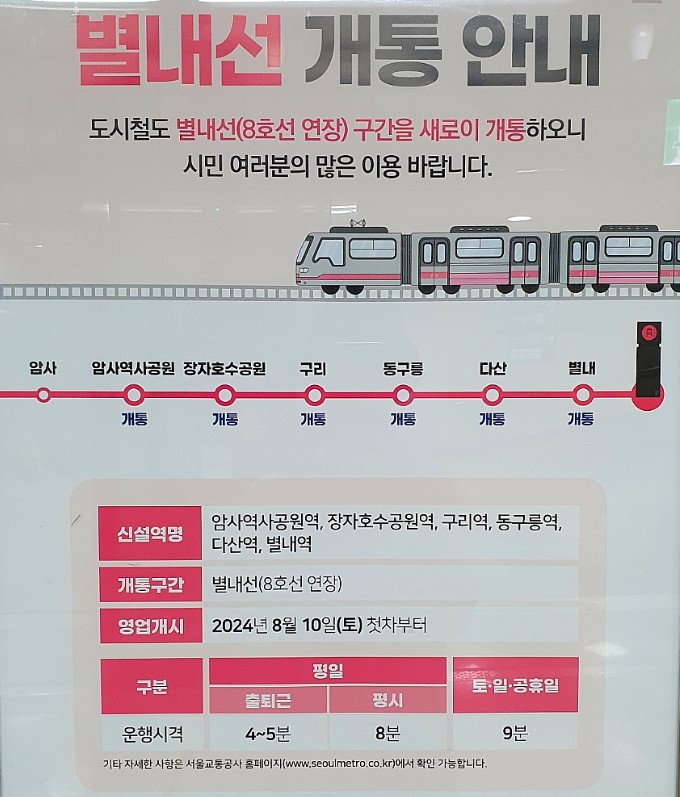 별내역 8호선이 2024년 8월10일에 개통되었습니다. 이는 잠실역까지 약 30분만에 도착이 가능하기 때문에 경기도권에서 출퇴근시 큰 비용절감과 시간 감소를 제공합니다. 8호선 별내역 지하철시간표를 확인하시어 편리하게 사용하시길 바랍니다.