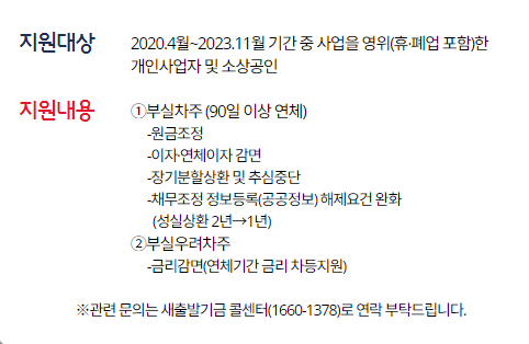 코로나19로 인해 매출이 감소하거나 영업에 큰 타격을 입은 소상공인 및 자영업자 재정적으로 어려운 상황에 처한 사업주, 특히 금융기관에서 대출 상환에 어려움을 겪고 있는 경우