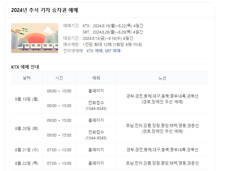 2024년 추석 기차표 예매는KTX는 8월 19일부터 22일까지, SRT는 8월26일부터 8월29일까지 진행됩니다. 코레일과 SRT에서 각각 다른 날짜에 예매가 시작되므로, 사전에 일정을 확인하고 준비하는 것이 중요합니다. 기간내에 확인하시어 꼭 예매하시길 바랍니다.